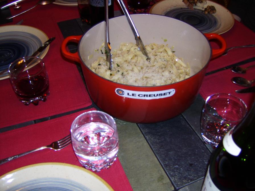 I thought this simple dish would be a relatively “light” pasta course to include between two heavy hitters.  Plus, it would highlight my ability (or inability) to successfully make homemade pasta.  I started with the basic preparation…olive oil, garlic and fettucine, but then added my own “deconstructed pesto” addition by throwing in toasted pine nuts, chopped basil and a ton of Parmesano Reggiano.   The Sopranos cookbook is great and everything, but I’m big on artistic license.  Everyone dug it, I think it provided the intended intermezzo moment between two killer courses.