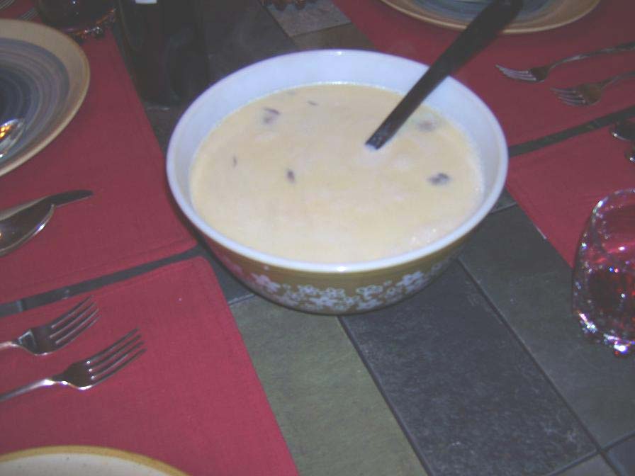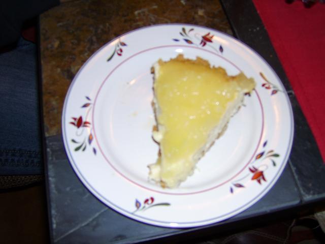I was going to make my famous signature dessert, “Satan’s Glorious Victory” (several rings of flourless chocolate torte and Nutella HELL), but opted for something “light”…relatively speaking of course.  This is an easy dessert to make, even easier than the soup, but one adjustment to the recipe was a longer cooking time to get it to really set up.  It reminds me of a good version of one of those frozen Sara Lee desserts.  I think everyone took a good 45 minute break after the behemoth lasagne, but they all came back to the table and wolfed it down.  Happy eating by one and all.
