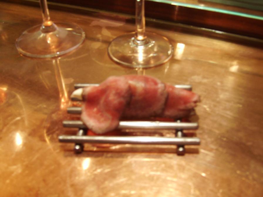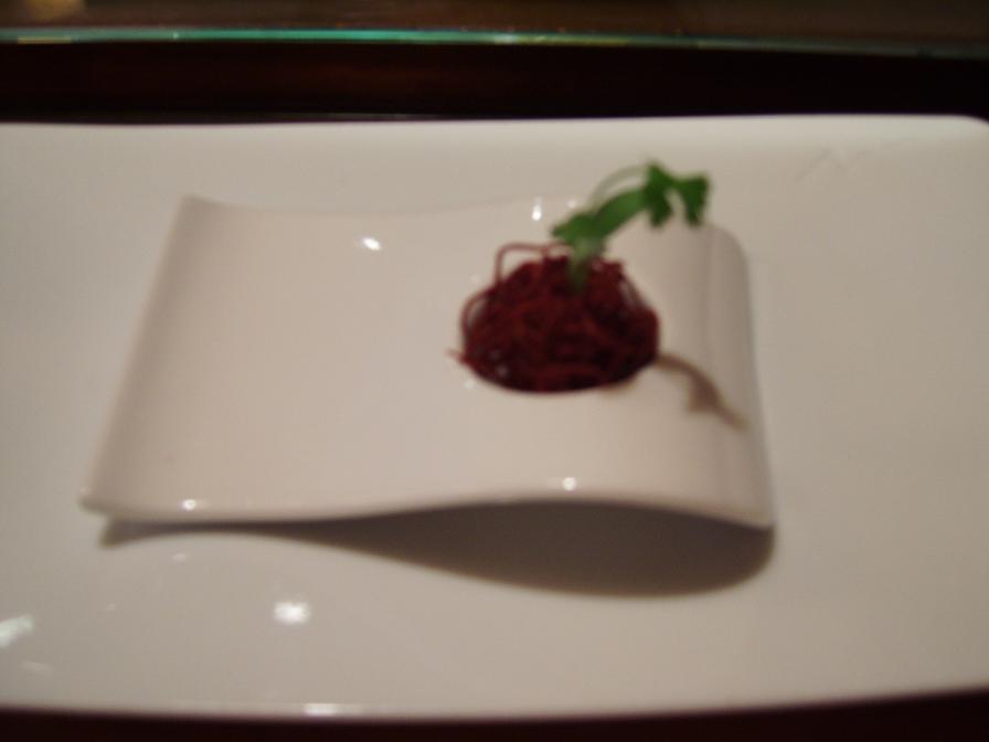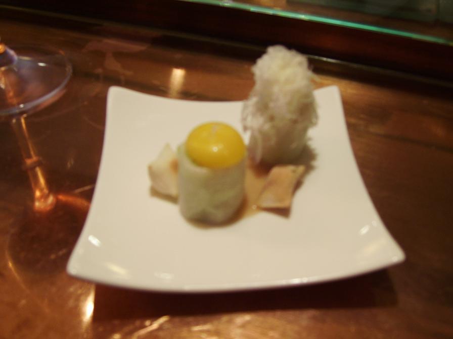 I love sea urchin.  My date got the opportunity to find out she does NOT like sea urchin.  A very simple presentation….a nice piece of fresh urchin topped with hibiscus air.  Two tasty little bites.