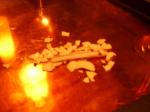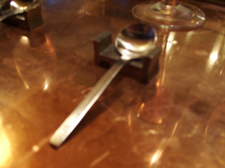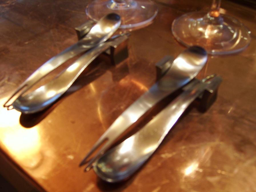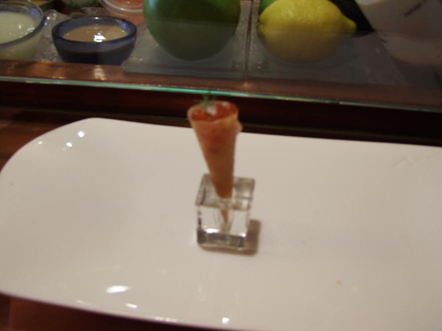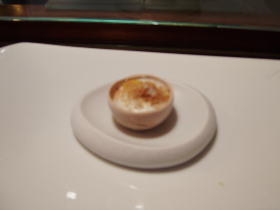 Sorry for not having a pic, but it was another one to “eat quickly”…….basically just a curry flavored bite-sized ball of popcorn that has been treated with liquid nitrogen. It’s a tasty bite, but the fun thing is when you eat it and breathe out through your nose like the chefs tell you, huge billows of “smoke” pour out of your nostrils.