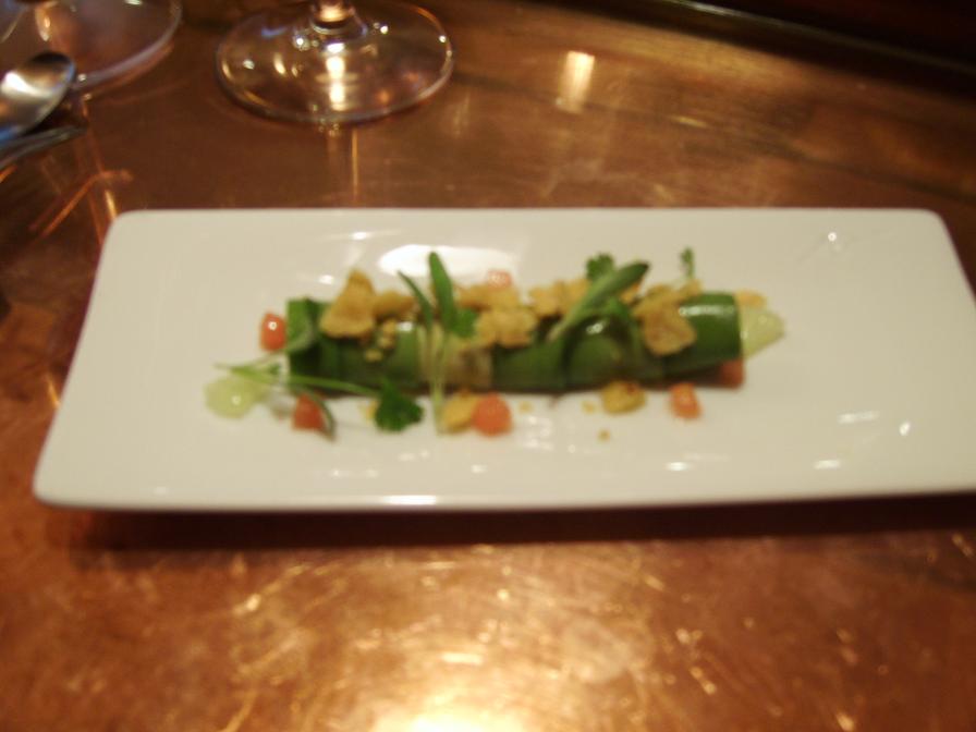 You can’t see this very well, but it is a layered dish that has a creamy zucchini puree on the bottom and a single, beautiful layer of zucchini seeds in a gel on top of that.  When I read about this dish I thought “eh”, but it ended up being very impressive.  Besides the obvious work that goes into preparing it, there is way more flavor than one would expect from the humble squash.  Plus it was seasoned perfectly…..juuuuust enough salt to make it an addictive little treat.