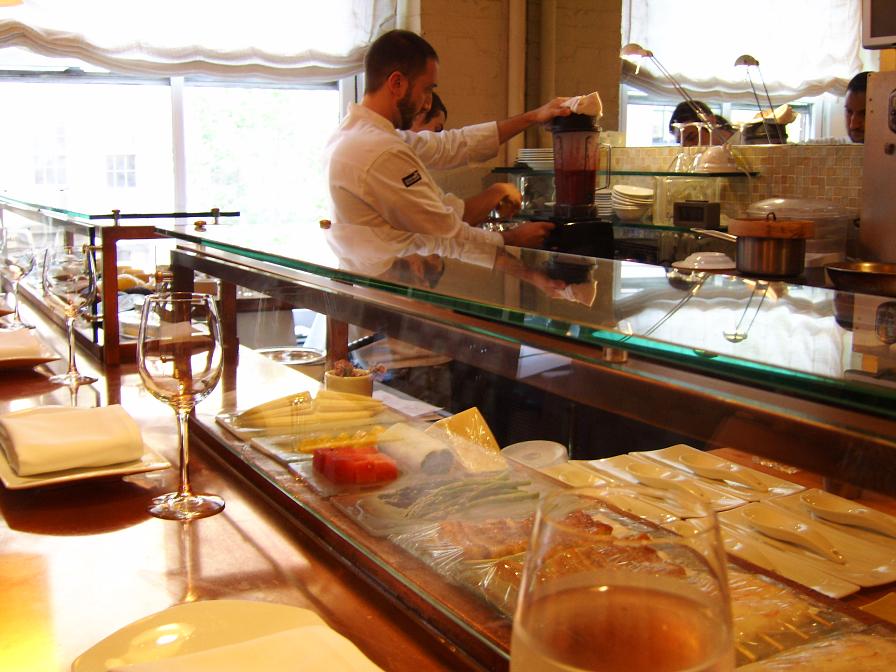 Jose Andres’ “minibar” is a restaurant within a restaurant, located upstairs in Cafe Atlantico, a stone’s throw from the National Archives in DC.  I did eat at Cafe Atlantico in March when I was in town on business, and the experience prompted me to do all I could to secure seats at minibar once I found out I was going to be in town on vacation last week.  Basically, minibar only has six seats which are filled twice per night, and you have to call right at 10am one month to the day in advance to get a reservation.  I dialed and redialed on two phones on the morning of April 30th, finally getting in at about 10:04, at which time I scored the last 2 seats for the 6pm seating.  After talking to people in DC, I really got lucky since it was my first try and I only had a 2 day window for dinner.  Once you score a reservation, then you work with the coordinator to email personal information back and forth……dietary restrictions, credit card info, etc.  I know to many people this all has to sound pretty pretentious, and I will admit this type of experience is not for everyone.  However, this type of dining is right up my alley…….small bites of exotic and delicious food over the course of 2+ hours.  Don’t get me wrong, I do look at this type of meal as the ULTIMATE special occasion….from both a caloric and monetary standpoint.  This is in no way a normal experience for me.  The last time I did something similar was at Manresa a couple of years ago.  So it was one long month between the time I made the reservations and when we were seated……