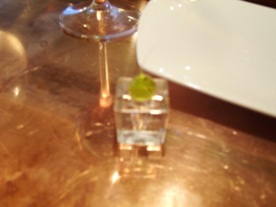 This is a shot of very good Spanish olive oil encapsulated in an isomalt shell.  For any Top Chef fans, this is the technique Marcel couldn’t get right in Hawaii because of the humidity.  The shell was thicker than I was expecting, but did not detract from the flavor of the wonderful olive oil, accentuated with a small amount of vinegar and few grains of salt.