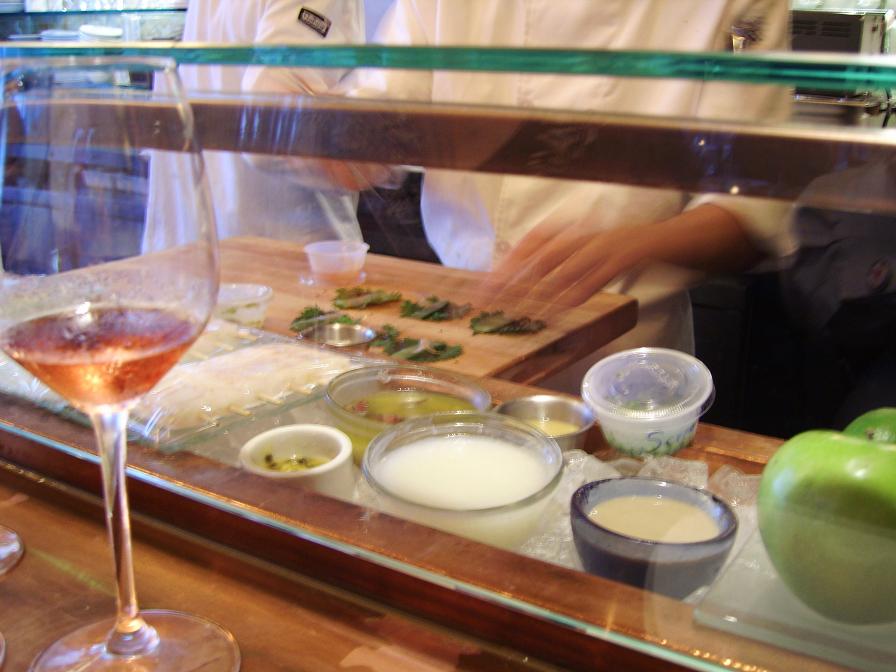 My date and I got to the Penn Quarter area pretty early in the evening, arriving at Cafe Atlantico right at 5pm so that we could sit and relax with a drink and chat for a while before being escorted upstairs.  We enjoyed a couple of signature cocktails…..a “Magic Mojito” and a Pineapple Caipharina.  Before long, our server Daniel came down to discuss our drink and wine selections for dinner.  I settled on the same bottle of Adelsheim Rose that I enjoyed in March.  It’s a very tasty wine that is just dry enough….and I thought it would be a safe bet flavorwise with the extreme diversity of flavors ahead of us.  The party of four that would be joining us was running a little late, so we got to our seats at 6:10 and they ran us through all of the “instructions”.  I know, instructions on how to eat dinner…..but in this format it’s necessary.  Basically, the setup is like a sushi bar, so as courses are available you pull them off of the counter, and the servers constantly come up behind you to take away plates, refill glasses and provide you with course-specific flatware.