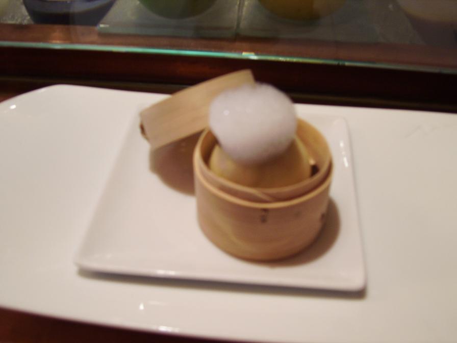 This incredibly cute little dish in a one-bite steamer provided a wonderful counterpoint to the previous, spicy course.  It’s a small bun of steamed brioche with some kind of cream/cream cheese in the middle, and osetra caviar and lemon air on the top.  A nice little comforting “bread course”.